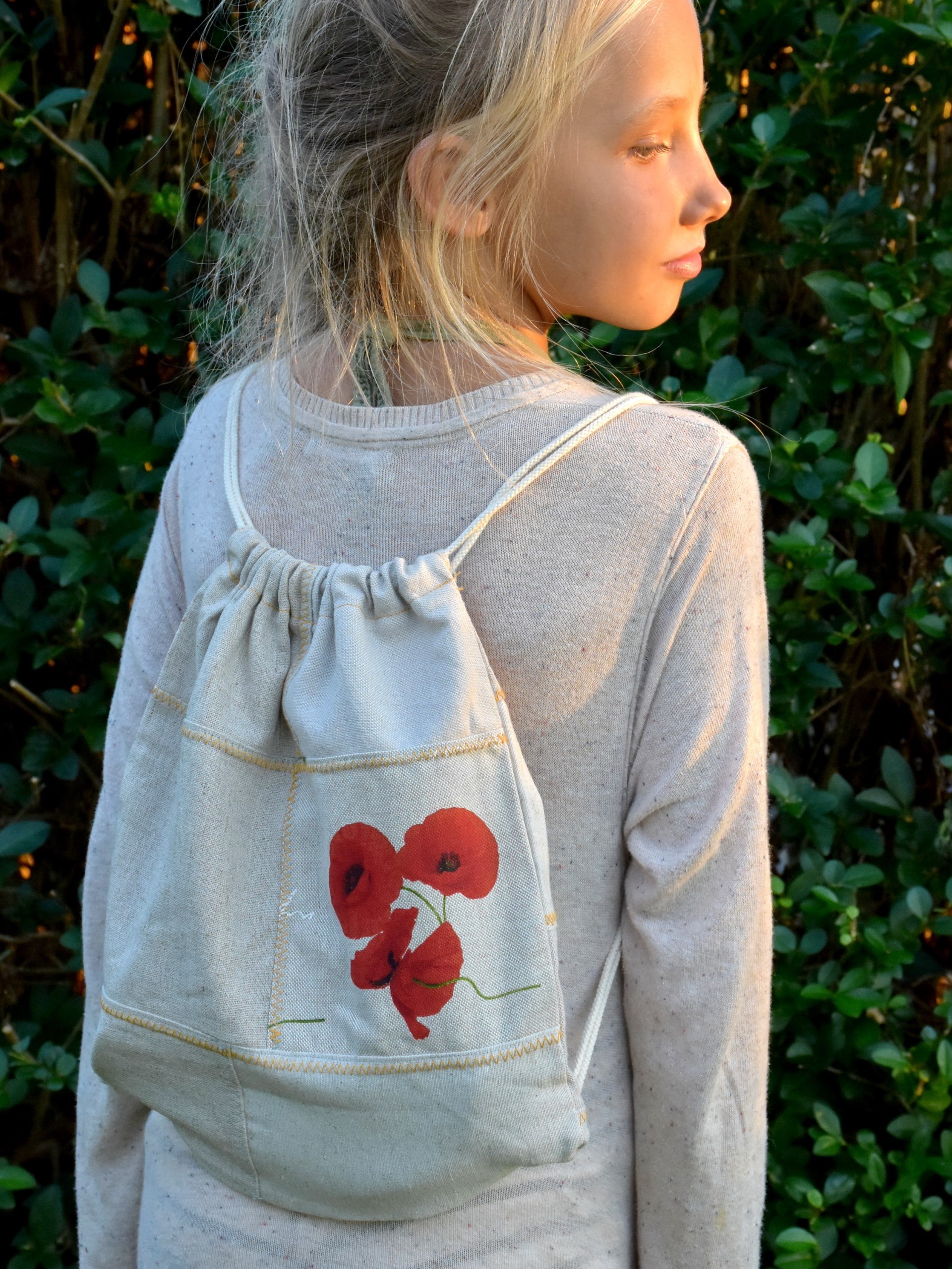 Ta nahrbtnik za deklice je sešit iz različnih koščkov platna, motiv makovih cvetov pa ga naredi prav čarobnega. Vrvice so bombažne, v beli barvi.